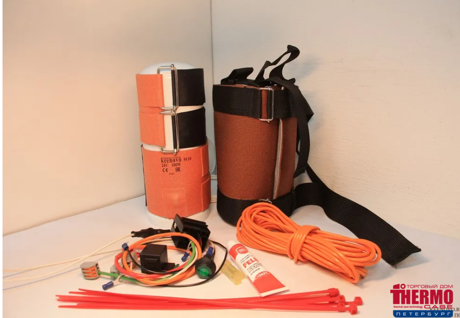 Установите Термочехол и плотно утяните текстильные стропы. Убедитесь, что температурный датчик, расположенный на шнуре питания Нагревателя расположен снаружи Термочехла.
