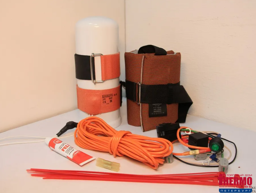 Установите Термочехол и плотно утяните текстильные стропы. Убедитесь, что температурный датчик, расположенный на шнуре питания Нагревателя расположен снаружи Термочехла.