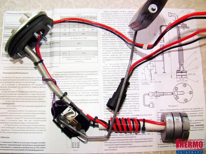 Выключатель с индикацией устанавливается в салоне в зоне видимости с места водителя. Включение подогревателя осуществляется нажатием клавиши. Насадки рассчитаны на забор до 420 л/ч топлива при температуре от -40°С до +45°С. Время разогрева щелевого фильтра и топлива в топливозаборной трубке электрическим подогревателем в предпусковой период до достижения температуры плавления парафинов (депарафинизации) составляет не более 3-5 минут. В условиях низких температур возможен непрерывный подогрев топлива во время работы двигателя.