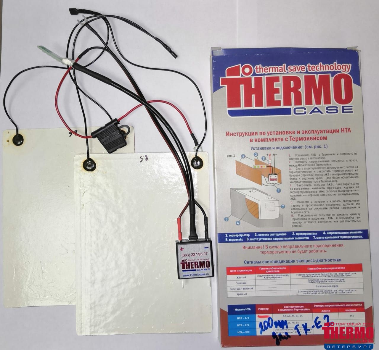 Состоит из: терморегулятора, блока предохранителя, дисплея экспресс диагностики (светодиодная информативная панель) и 2-х инфракрасных нагревательных элементов.Размер нагревательного элемента (длина: 200мм, ширина: 150мм, толщина: 0,5мм)